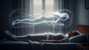 Tam uyku–uyanıklık sınırında, beynin algı kapıları esneyince, yüklenmiş imgeler sahneye çıkıyor: Bedenin üzerinden yükselme hissi, “varlık” gölgeleri, tünel…